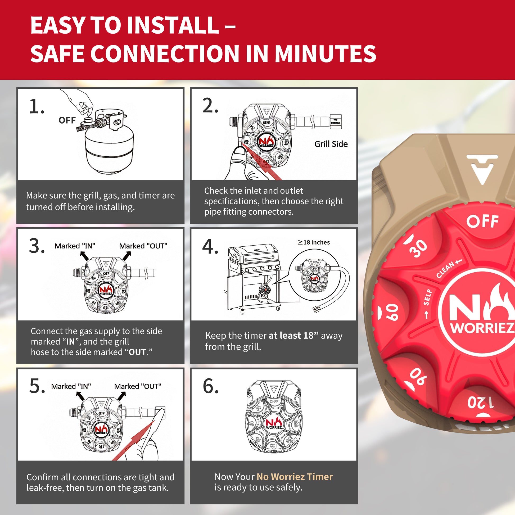 • CAUTION: Installing gas appliances can be dangerous. Although NO WORRIEZ Timer provides information supporting DIY efforts, all gas connections should be made by a professional gas installer. We advise working with a certified NFI Gas Specialist. Start your search here: https://www.nficertified.org/public/